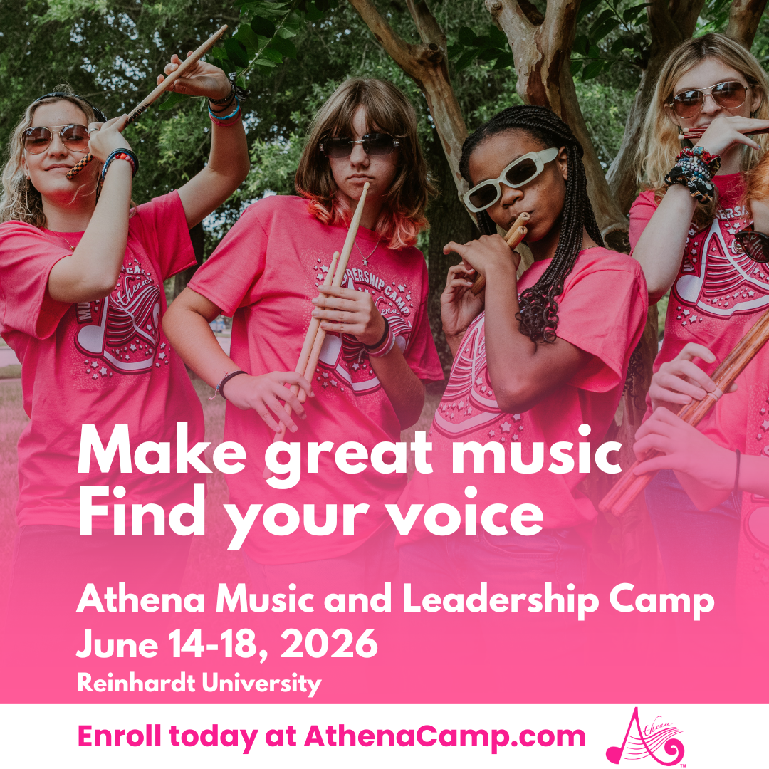 Athena Music and Leadership Camp is June 14-18, 2026. Athena is a comprehensive, five-day, residential music camp that focuses on developing the leadership skills needed to excel in music and in life. Located only 45 minutes north of Atlanta, sessions include full band, master classes, chamber music, theory, conducting, private recital presentations by professional musicians, and our signature Athena leadership and empowerment seminars. Our summer camp is open to middle and high school young ladies who play brass, woodwind, or percussion instruments.